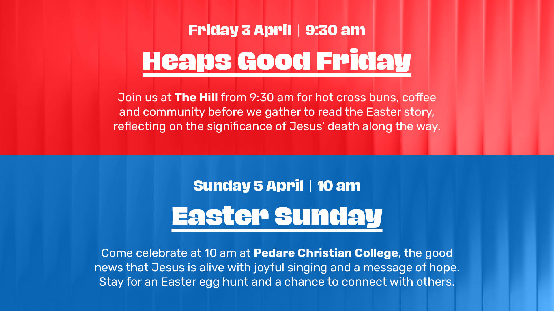 Join us at The Hill from 9:30 am for hot cross buns, coffee and community before we gather to read the Easter story, reflecting on the significance of Jesus’ death along the way.