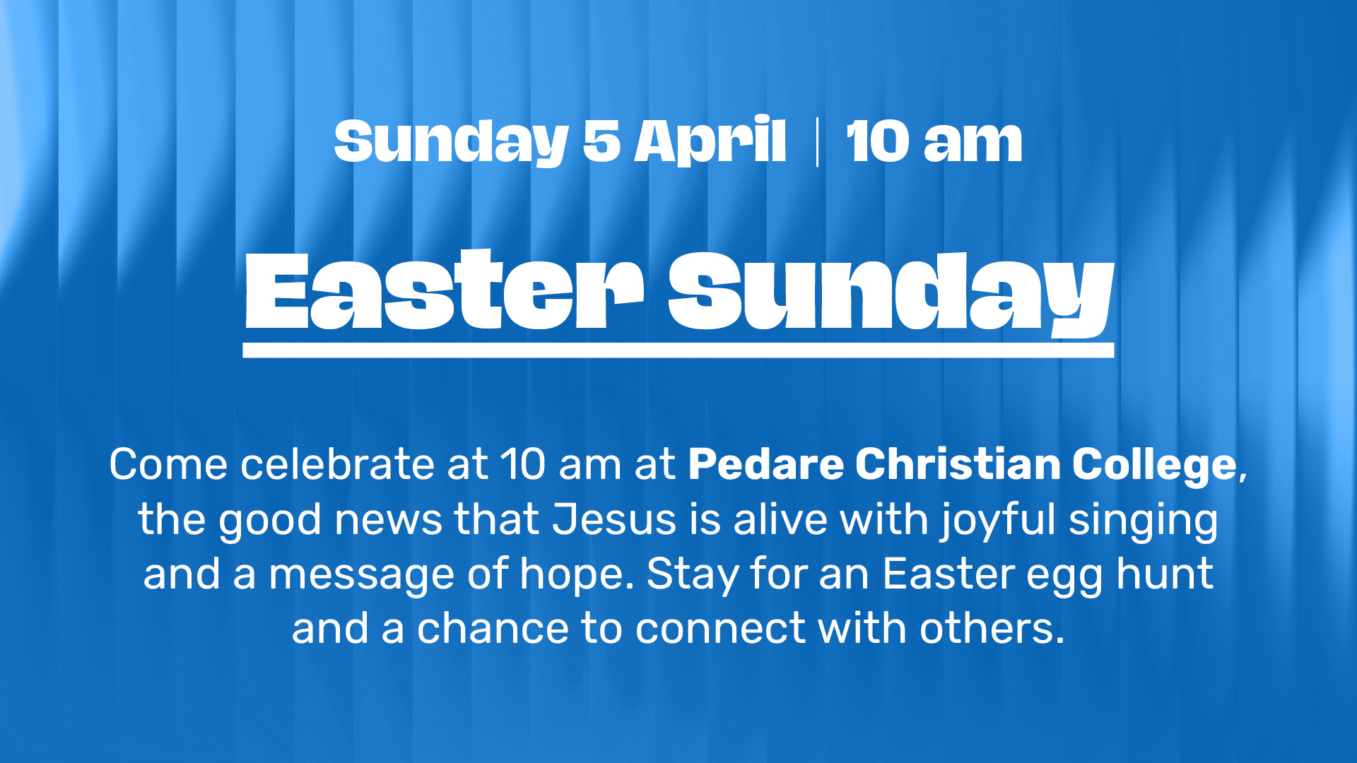 Come celebrate at 10 am at Pedare Christian College, the good news that Jesus is alive with joyful singing and a message of hope. Stay for an Easter egg hunt and a chance to connect with others.
